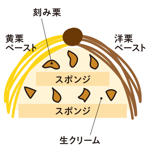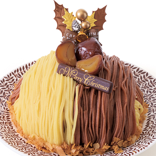 黄栗と洋栗を交互に絞った栗ペーストの中には、こだわりの生クリームと刻み栗が隠れています。2種類の栗の味が楽しめる贅沢なモンブランです。